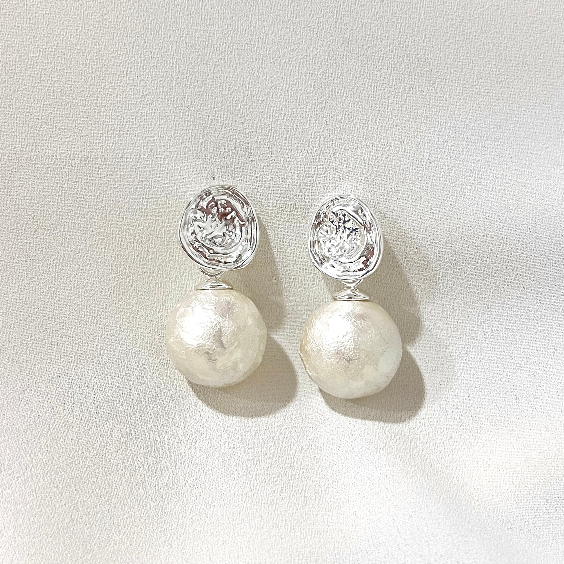 Estos aretes tienen un diseño elegante y clásico: una base dorada de textura orgánica que sostiene una gran perla redonda, creando un contraste de brillo y sofisticación.