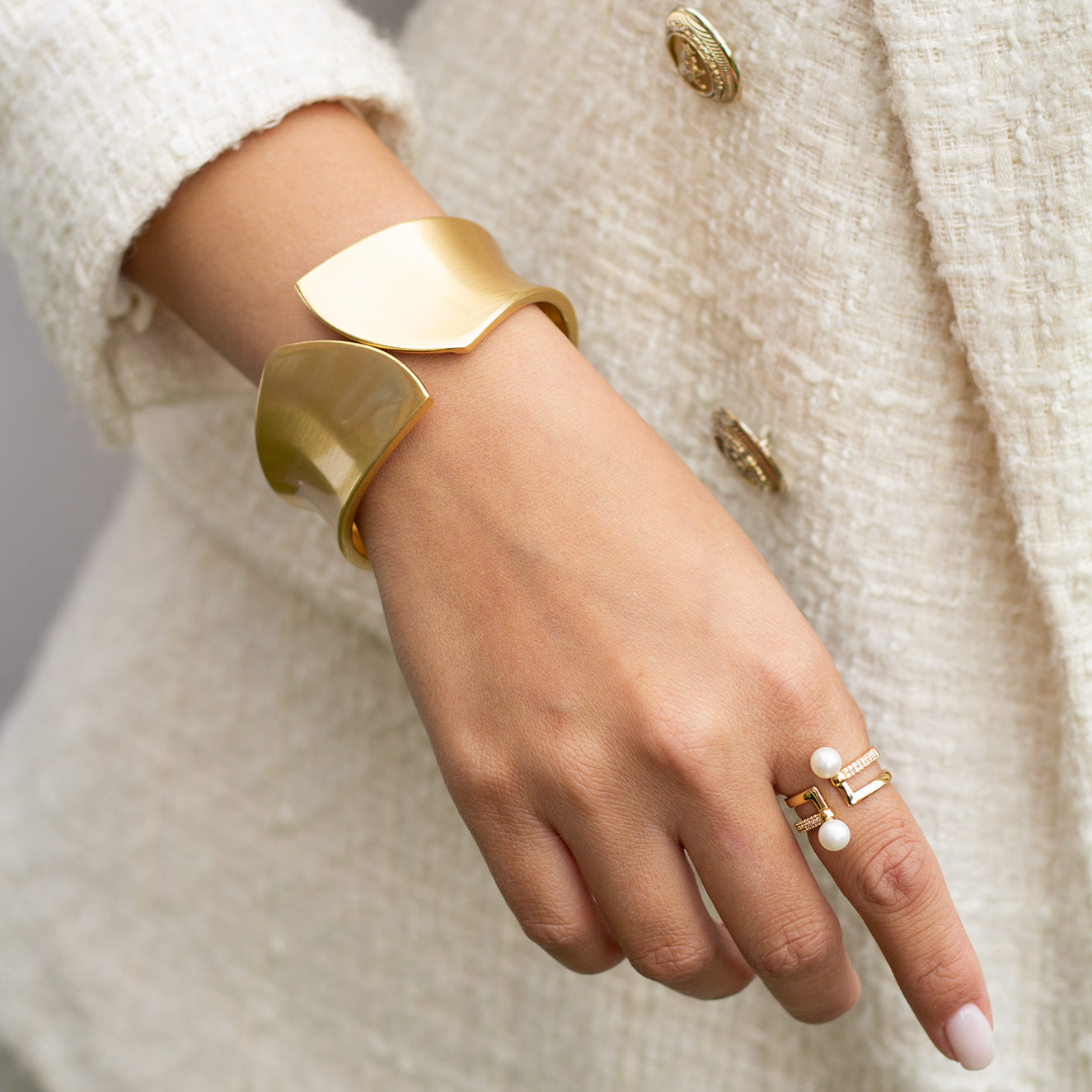 Siente la calidez de un abrazo dorado con este brazalete de diseño envolvente. Sus curvas suaves se deslizan delicadamente sobre tu piel, recordándote la importancia de amarte y valorarte a ti misma.