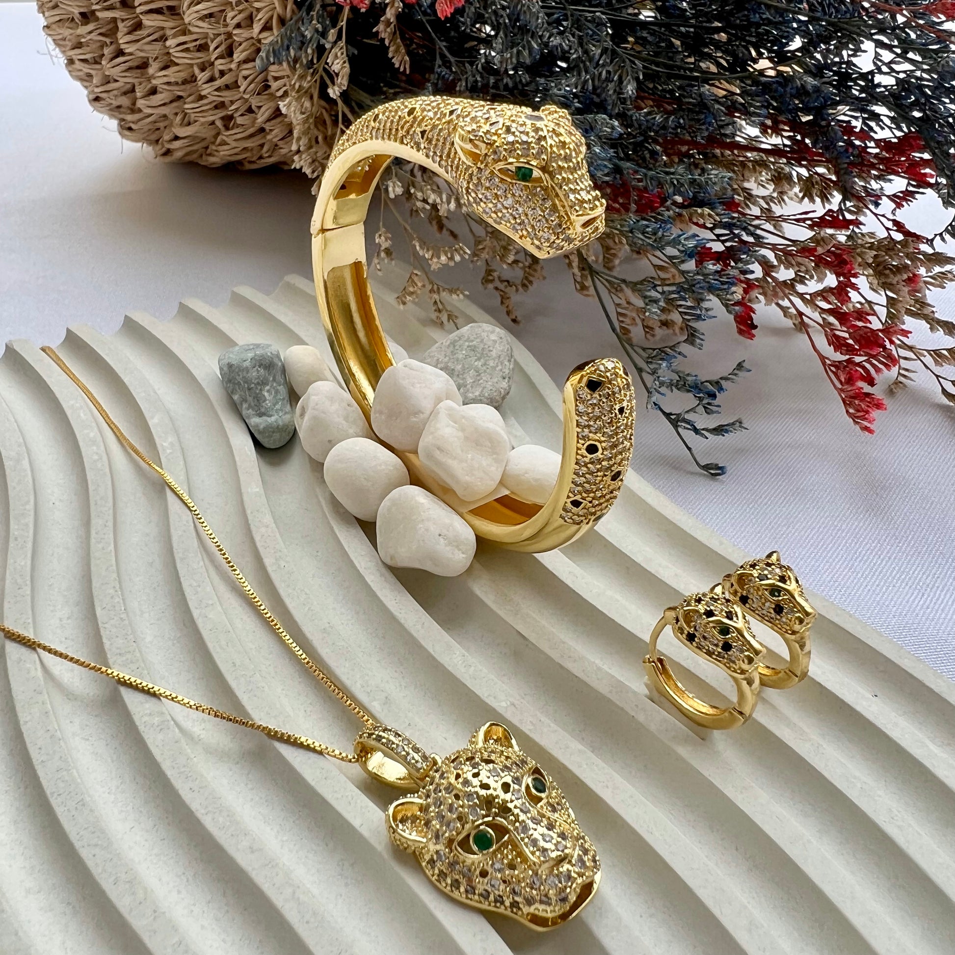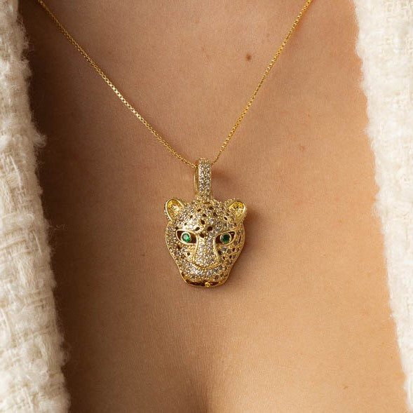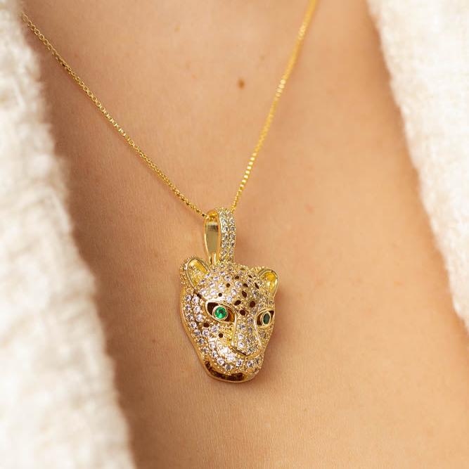 Este collar dorado con un dije de cabeza de felino engastado con circonitas blancas y ojos verdes es un símbolo de fuerza, independencia y belleza salvaje. El felino representa la valentía, la confianza y la conexión con tu instinto femenino. Un recordatorio de que eres una mujer poderosa y capaz de conquistar cualquier desafío.