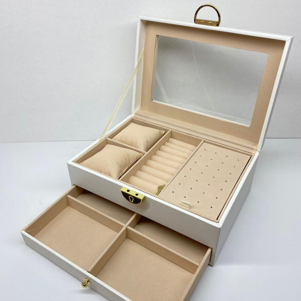 Dale a tus joyas el cuidado que merecen con nuestros lindos joyeros, diseñados para mantener cada pieza segura, organizada y siempre al alcance de tu mano. Su estructura elegante y funcional combina materiales de calidad, ideal para proteger tus accesorios del polvo y los arañazos.