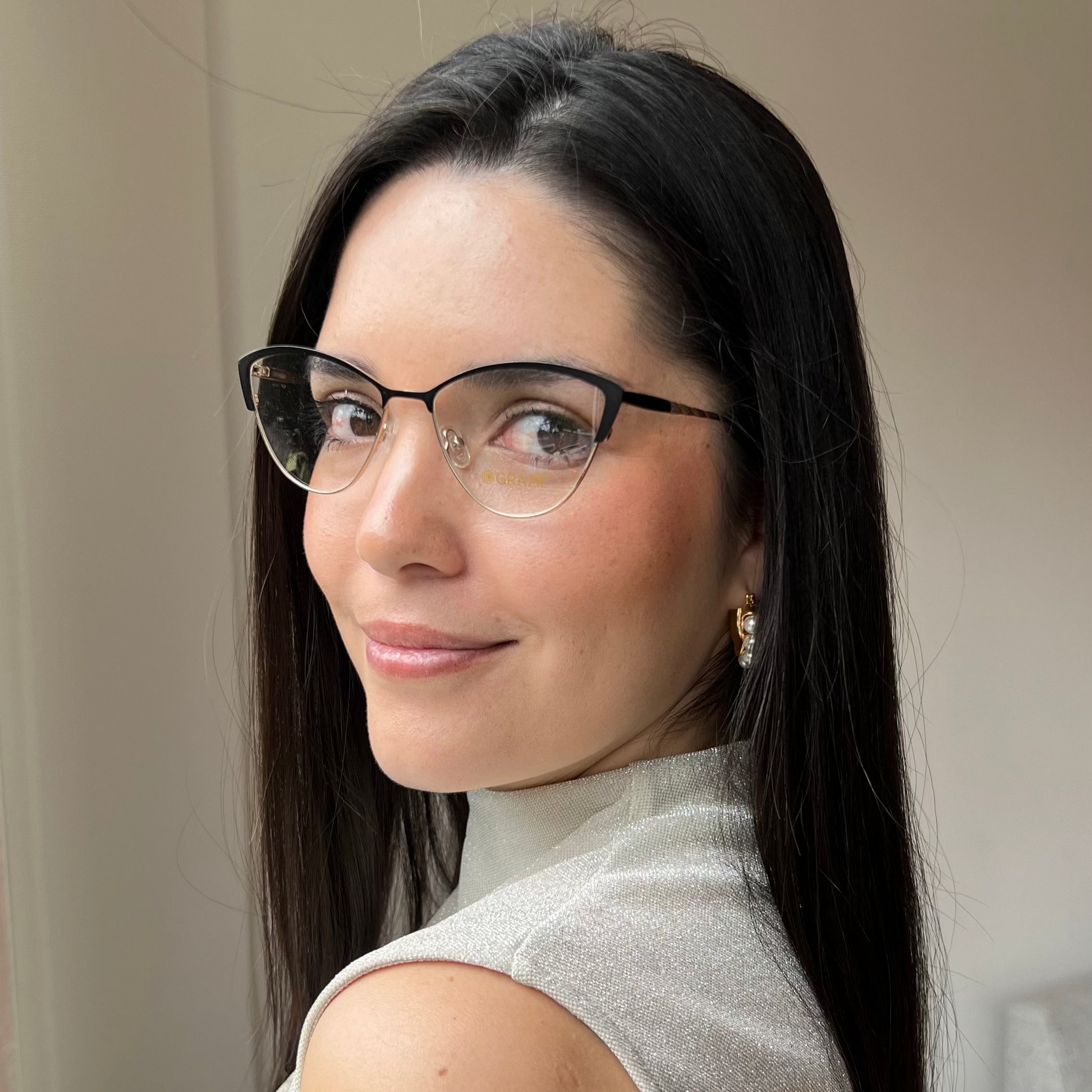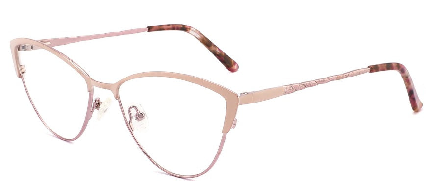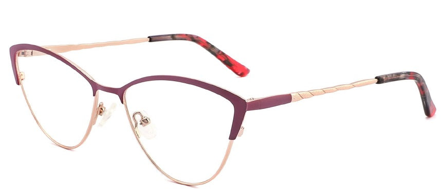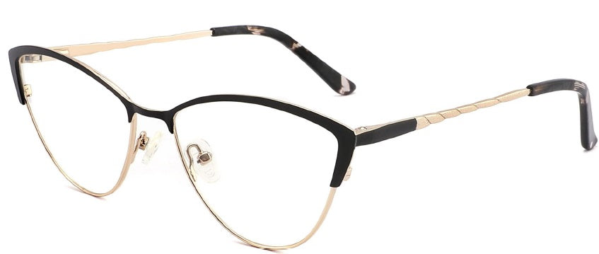 Esta montura "Aurora" presenta forma cat-eye (ojo de gato), que se caracteriza por su ángulo ascendente en las esquinas exteriores, lo que otorga un aspecto felino y favorecedor. El material de la montura de metal de alta calidad, en un tono dorado en la parte superior, creando un contraste elegante. Las patillas combinan un diseño clásico con detalles modernos, como brillos en la parte final.