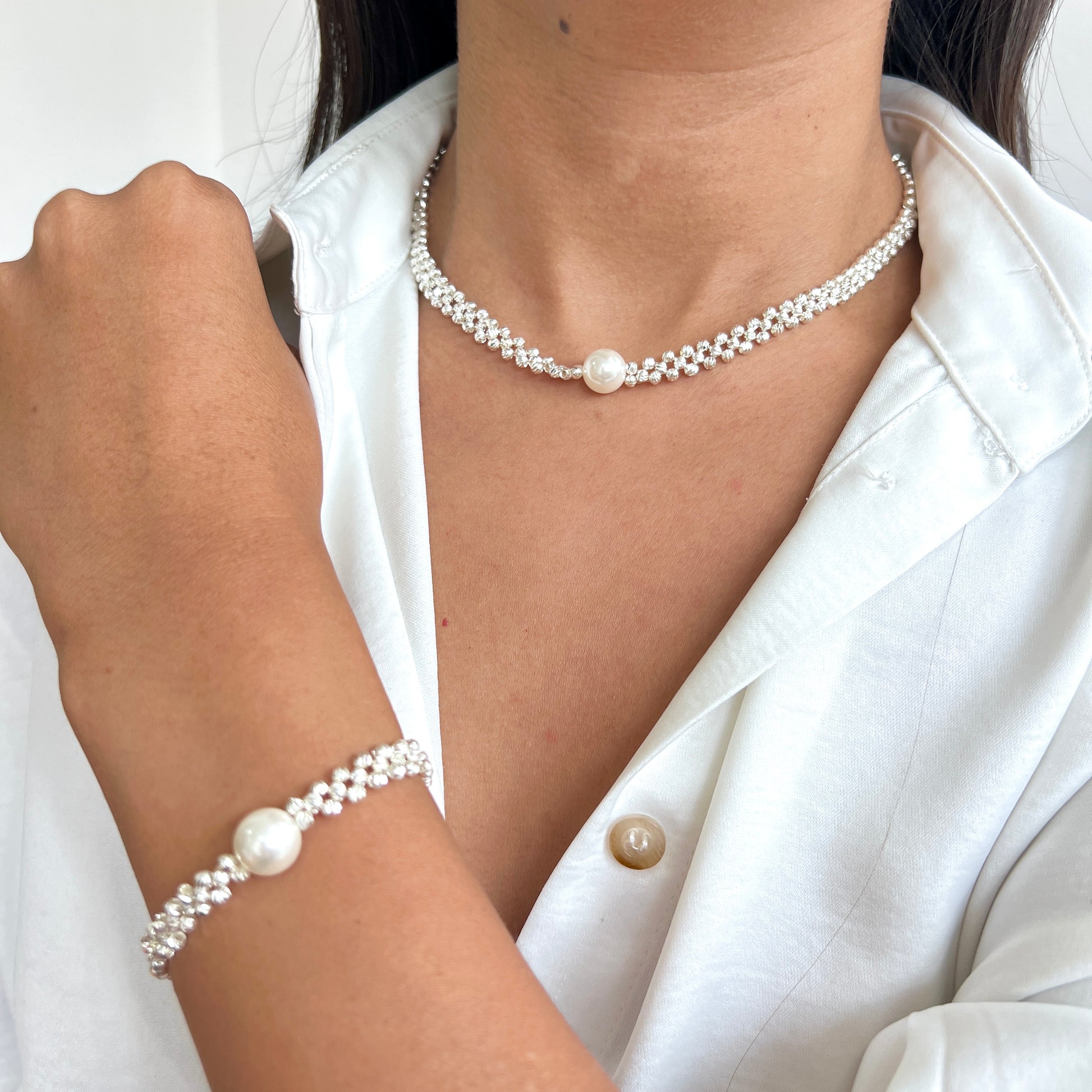 Set compuesto por collar tipo choker y pulsera con delicadas esferas plateadas y una perla central que aporta un toque de elegancia y brillo. Ideal para usar en ocasiones especiales o para elevar tus looks diarios con estilo y feminidad.
